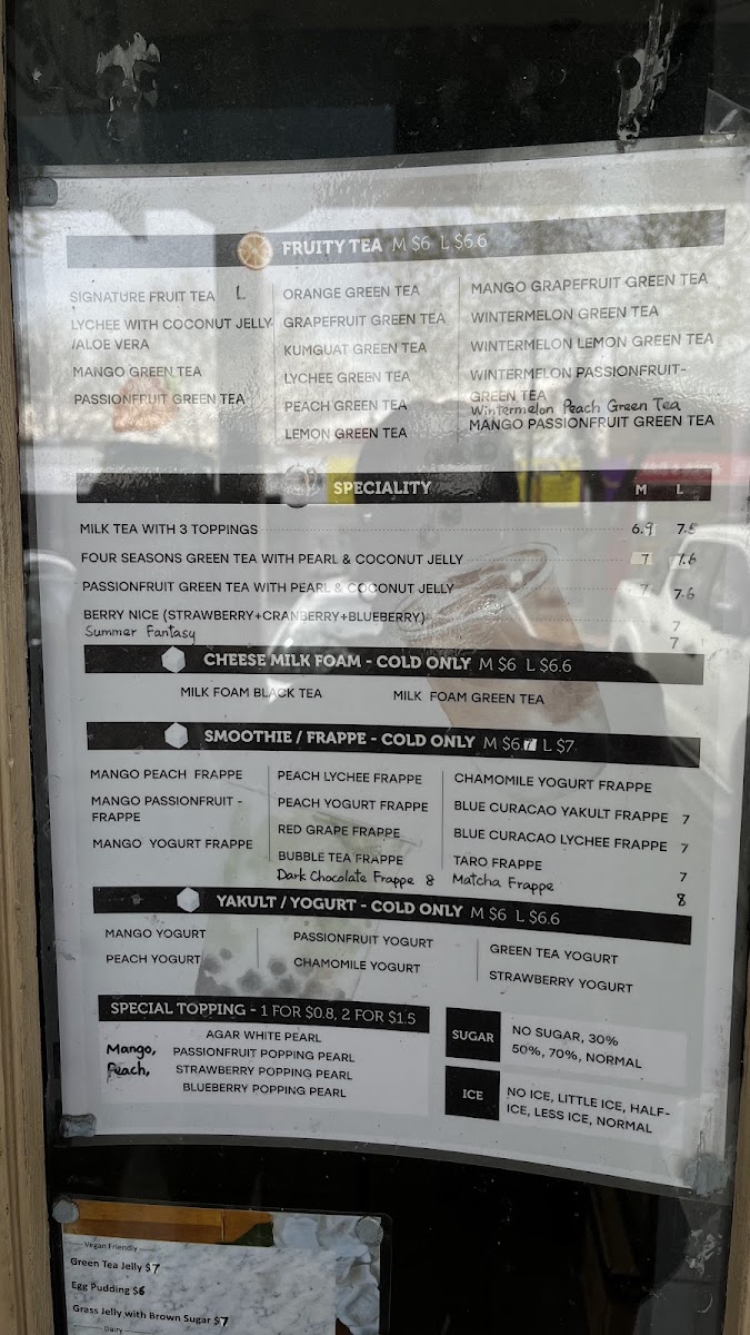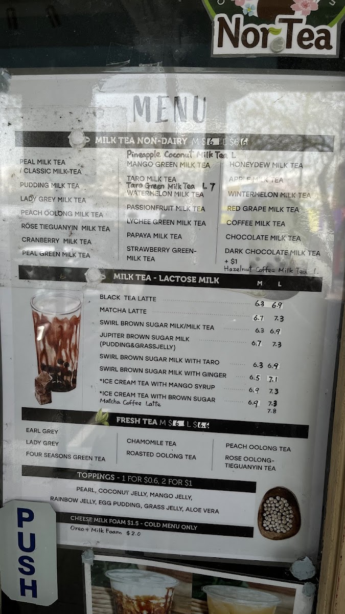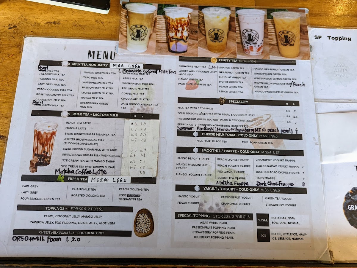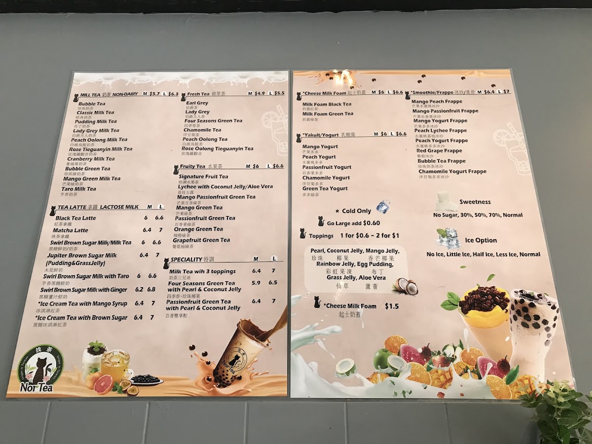 The menu at Nor Tea 找茶 offers a wide variety of beverages catering to different tastes, with a strong focus on fruity teas, yogurt-based drinks, and milk teas. Their Fruity Teas include refreshing options like Orange Green Tea, Winter Melon Green Tea, and Passion Fruit Green Tea, while their Yakult and Yogurt section features flavors like Strawberry Yogurt and Green Tea Yogurt. For those looking for something richer, the Smoothie and Frappé options stand out, with treats such as Chamomile Yogurt Frappé and Red Grape Frappé available in large sizes. The Milk Tea-Lactose Milk selection includes indulgent choices like Swirl Brown Sugar Milk With Ginger and Matcha Latte, while their Fresh Tea category serves up classic teas like Lady Grey and Roasted Oolong Tea. For a special touch, the Specialty drinks, such as Milk Tea With 3 Toppings and Passionfruit Green Tea, provide a unique twist on the traditional milk tea. There’s also a delicious array of Cheese Milk Foam options, including Milk Foam Black Tea and Milk Foam Green Tea. Finally, their Pearl Milk Tea Non-Dairy line offers options like Lady Grey Milk Tea and Mango Green Milk Tea. Each drink offers a unique experience, with the variety of choices ensuring there’s something for everyone.